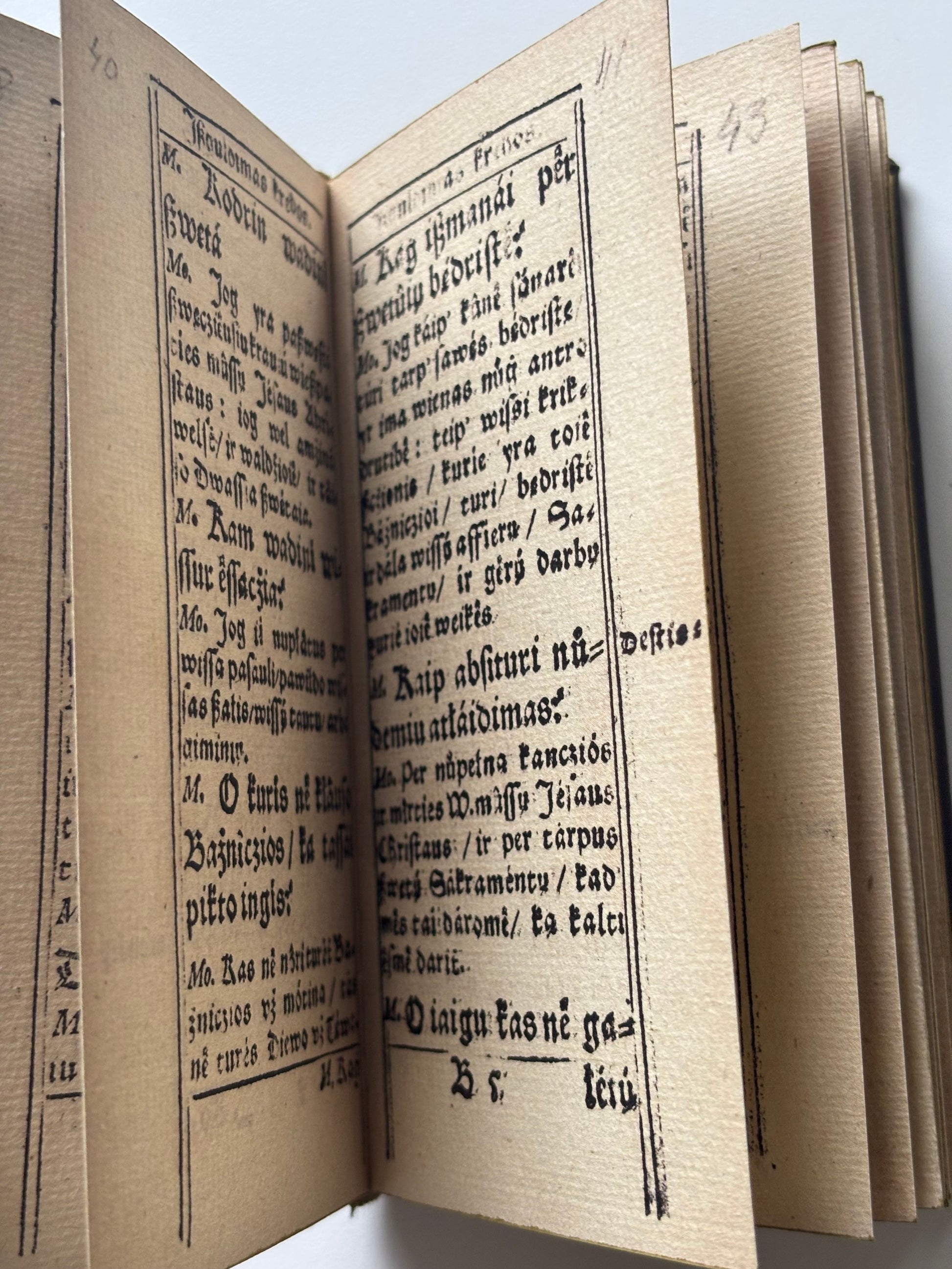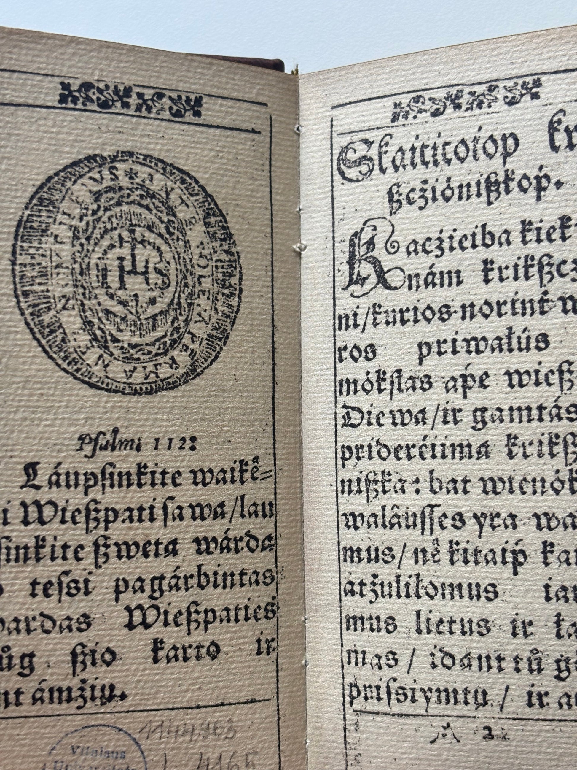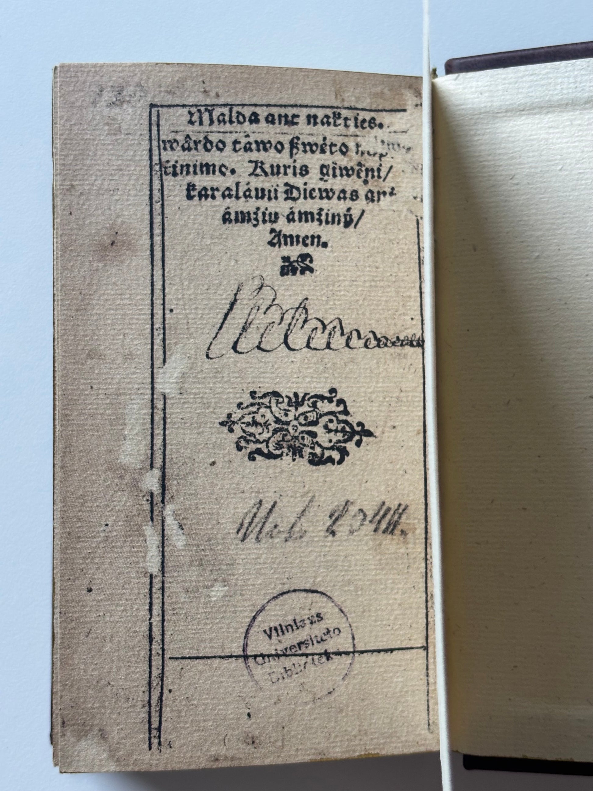 - Pirmoji knyga lietuvių kalba, išspausdinta Vilniuje 1595 metais. Tai unikalus ir vienintelis toks išlikęs leidinys, saugomas Vilniaus universiteto bibliotekoje.